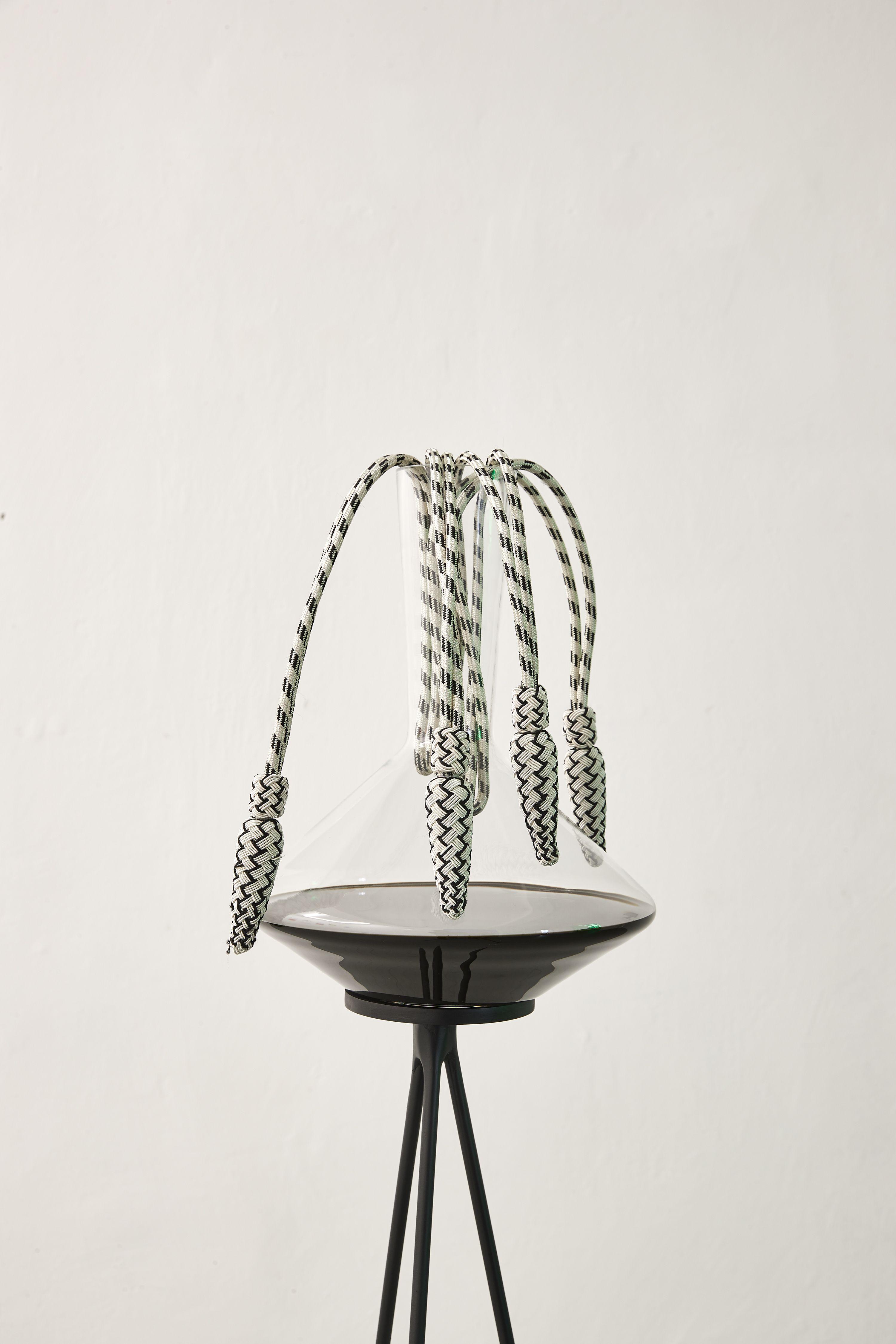 The sculpture The Water is Black consists of a glass vessel mounted on a three-legged steel stand, filled with used motor oil. Several artfully braided cords, of the kind typically found on high-ranking military uniforms, hang down from the vessel’s opening. These cords resemble drooping flower heads, creating an ambivalent visual language between ornamentation and decay. The black liquid alludes to industrial residue and toxic potential. Through its formal rigidity and symbolic weight, the work addresses themes of power, hierarchy, and their destructive impact.